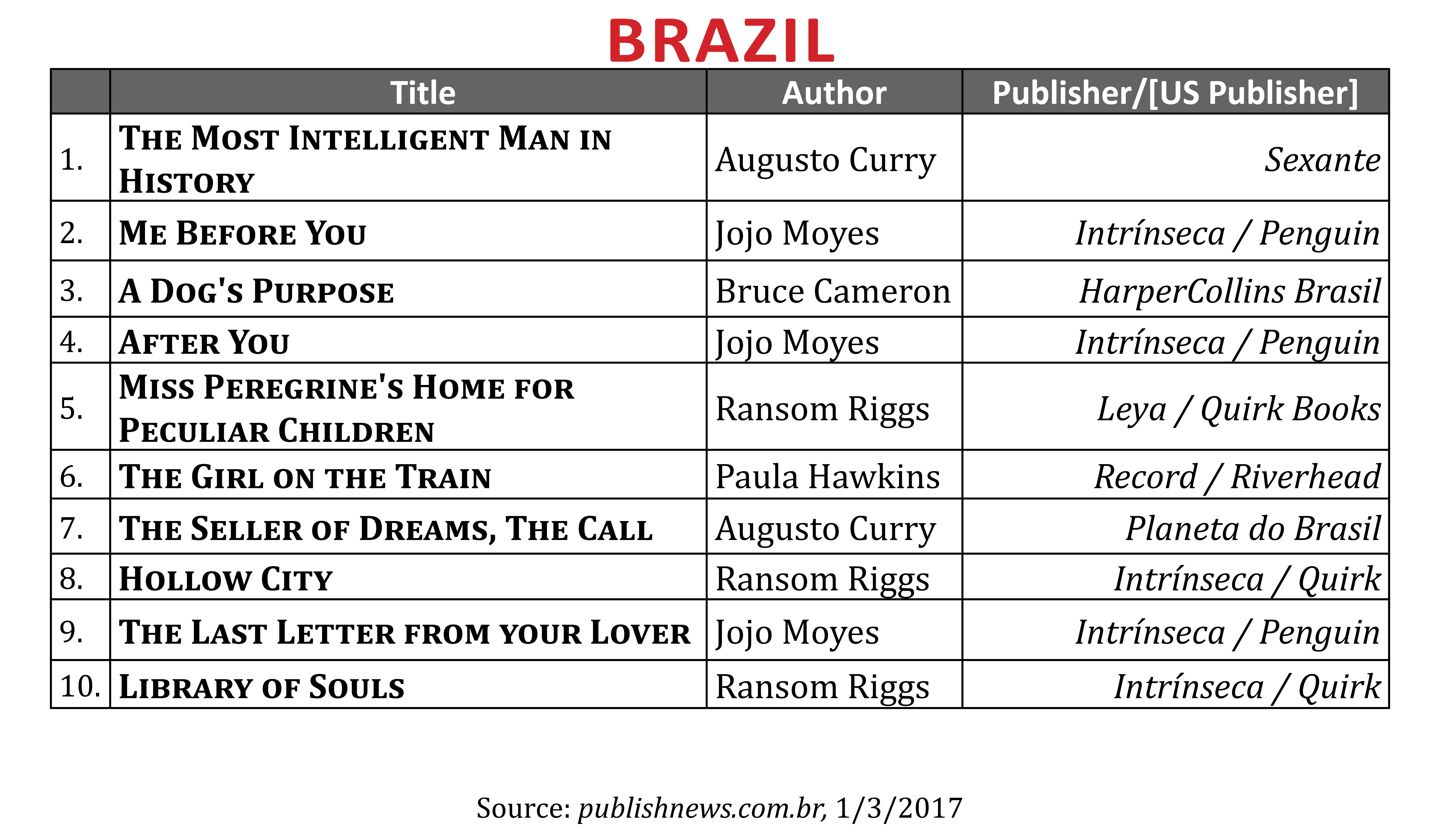 Every month, Publishing Trends runs fiction international bestsellers lists from four territories–France, Germany, Italy, and Spain. This month, our four regular territories are joined by two more: Brazil and Poland. Those books that have been published in English are listed with their official English-language title. All others are translated as literally as possible from the original. Where applicable, the US publisher is listed after the local publisher, separated by a “/”. The lists are taken from major newspapers or national retailers, which are noted at the bottom of each list.