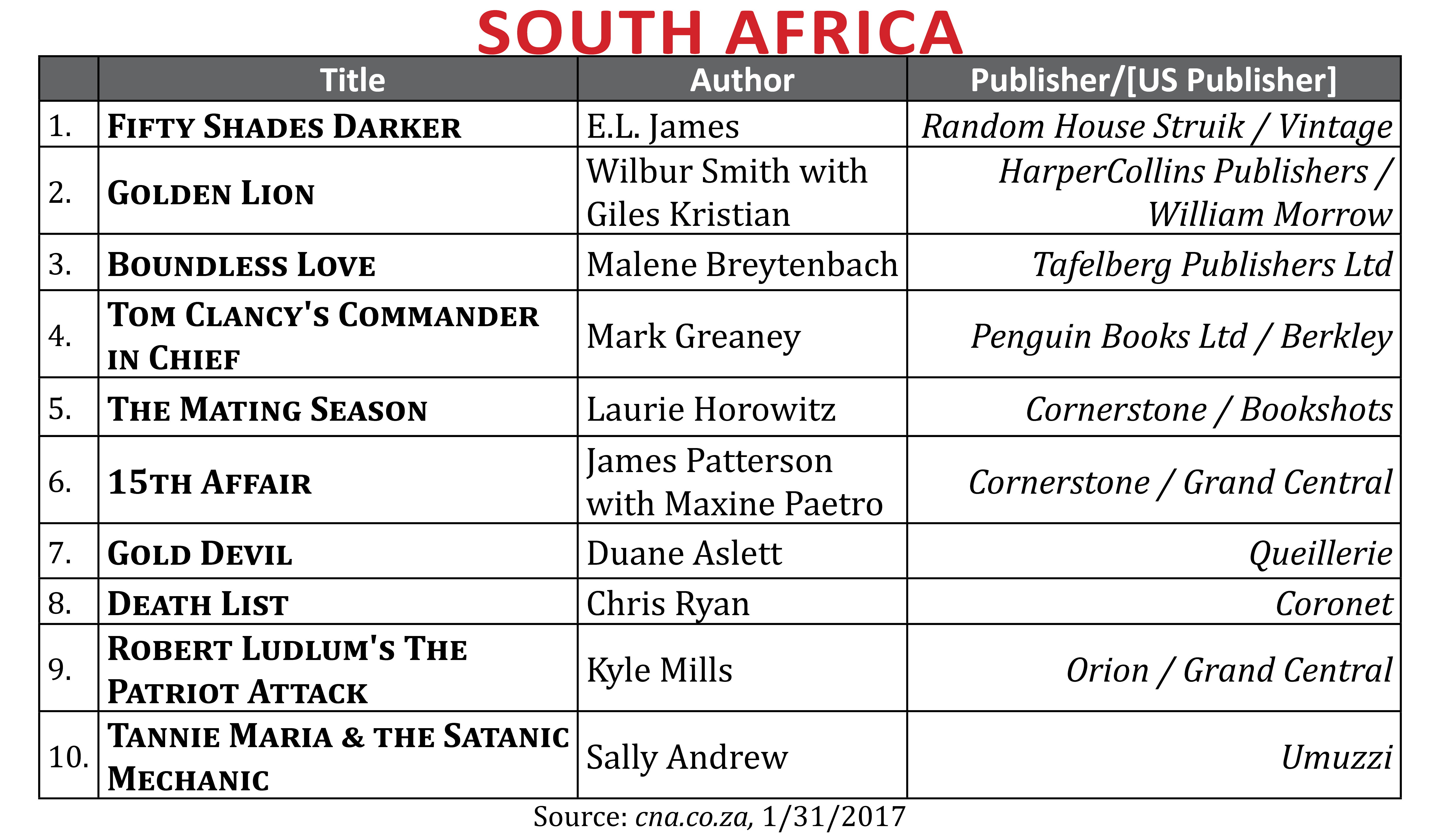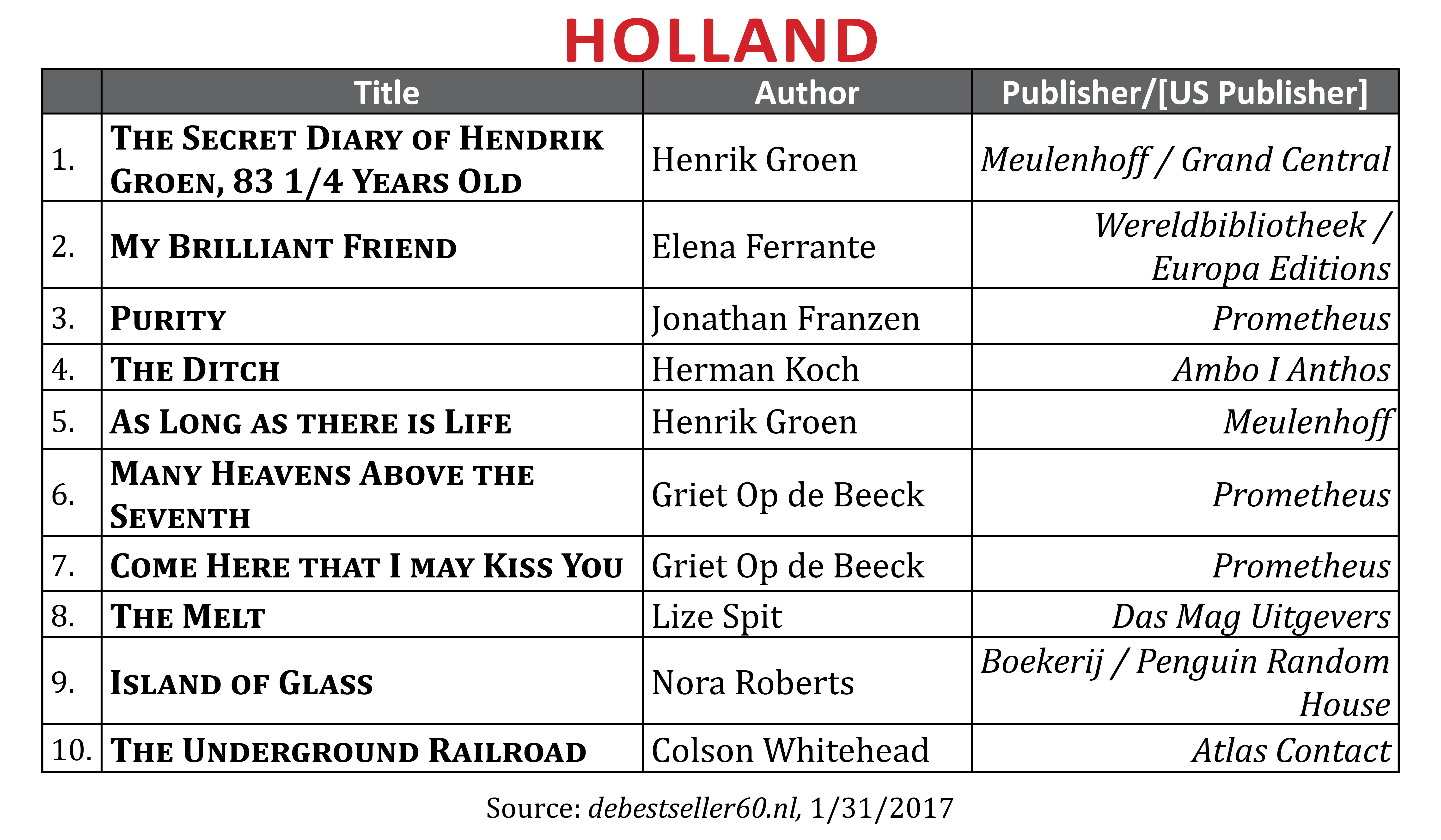 Every month, Publishing Trends runs fiction international bestsellers lists from four territories–France, Germany, Italy, and Spain. This month, our four regular territories are joined by two more: Holland and South Africa. Those books that have been published in English are listed with their official English-language title. All others are translated as literally as possible from the original. Where applicable, the US publisher is listed after the local publisher, separated by a “/”. The lists are taken from major newspapers or national retailers, which are noted at the bottom of each list.